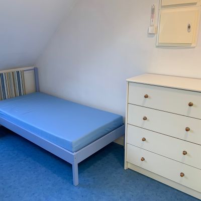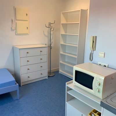Le sol est recouvert d'un revêtement plastique facile à entretenir, les murs sont peints d'un agréable bleu lavande.