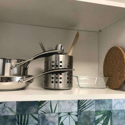 Cuisine aménagée et équipée : meubles hauts et bas, plaque de cuisson à induction, réfrigérateur avec compartiment congélation, four à micro-ondes, petite table et sa chaise, kit vaisselle et kit nettoyage, étagère, grande fenêtre côté jardin.